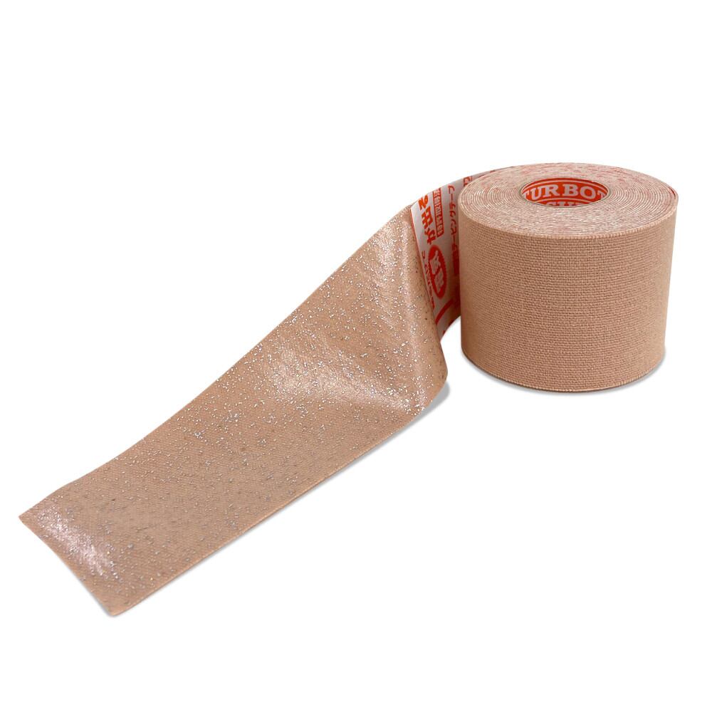 このテープは一定の伸縮性をもち、筋肉に沿って貼ることで筋肉障害の予防・保護に役立ち、さらに電位差をもつ銅(+)とアルミ(-)を粘着面に散布させ人体に貼付することで微弱な電気が生まれ、微弱電流による刺激を与えます。また、銅の殺菌作用により足の臭いなどにも対処できます。